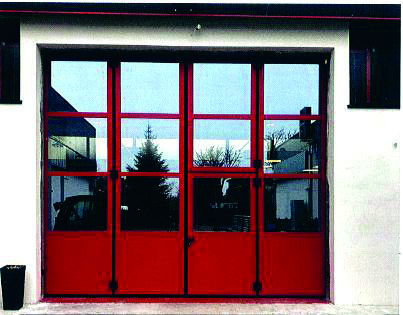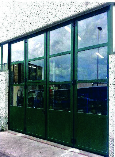 Pamje e jashtme portë libër me hapje njëanësore 0+6 dyer, me porta pedonale të montuar.
