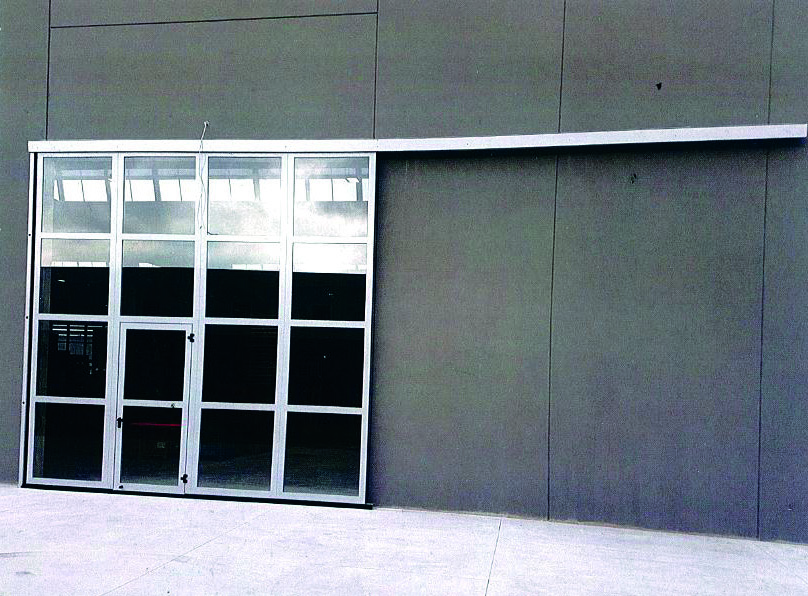 Pamje e jashtme e portave skorrevol me një derë me derë pedonale pa kufizues.