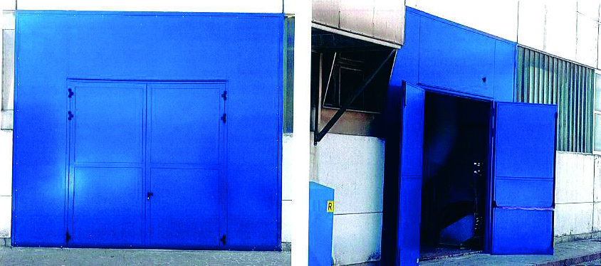 Pamje e jashtme me portë libër me hapje njëanësore 6+0 dyer, me portë pedonale të futur dhe motorizim.